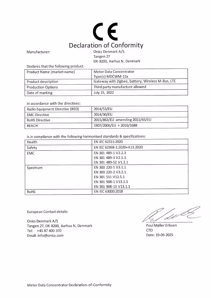 The Meter Data Concentrator can receive data from all meters communicating via Wireless M-Bus (T1 or C1 mode), a standard for meter communication in Europe. The data are then sent to the server via an LTE connection.
