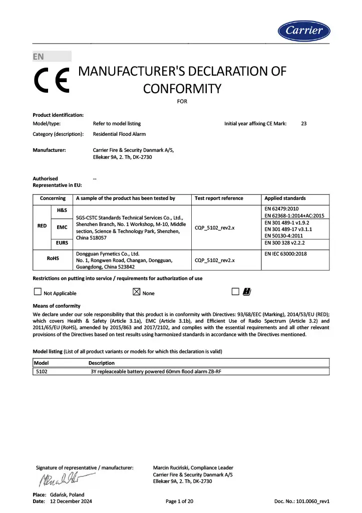 The Water Leak Detector has a built-in 85 dB siren that will sound an alarm when water is detected. The Zigbee wireless protocol lets the Water Leak Detector integrate with other Zigbee-based systems for security, insurtech, home care, and energy management.